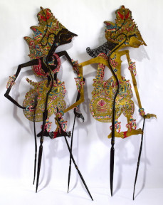 Lot Description:Two Shadow Puppets, Wayang Kulit, Painted in Colour & Gilt, Characters from an Epic Adventure, Indonesia, 20th C.