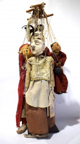 the marionettes have several strings attached to several parts of the body & are characters from Buddhist tales, hanging from a metal stand.