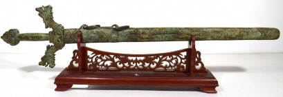 Lot Description:A Bronze Alloy Ceremonial Sword on Finely Carved Wood Stand