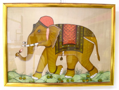 Lot #8176 - Gouache on Paper an Asian Elephant Walking with a Lotus Bud in his Trunk, Unsigned