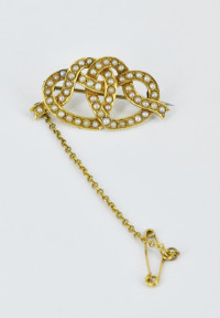 double hearts knot, featuring split pearls on 15ct yellow gold. Length 3cm. Weight 5.5g -