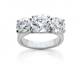 The three stone diamond ring is claw-set to the centre with a round brilliant-cut diamond weighing 3.01 carats, between a pair of similarly cut diamonds weighing 1.51 and 1.50 carats respectively, size L½, the inside band set with a circular-cut diamond. -