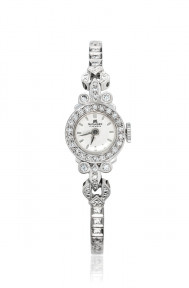 Dial: silvered Calibre: manual winding, 21 jewels Case: 18ct white gold Case Number: 214674 Closure: palladium and diamond-set box link bracelet Dimensions: 14mm diameter, overall length approximately 155mm Signed: dial and movement -
