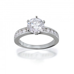 The round brilliant-cut diamond weighing 1.56 carats is claw-set between a line of channel-set diamonds together stated to weigh 0.35 carat, size L, signed Tiffany & Co., numbered 18435357. -