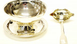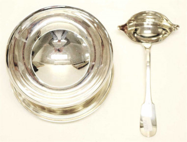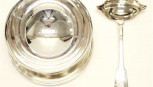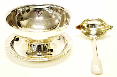 circular bowl with attached under plate, and ladle, (each with maker's mark), (diameter 14cm approx, bowl). -