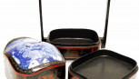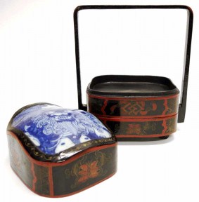 three level food carrier, with inlaid blue and white ceramic decoration to lid of lacquer container, (width 19cm approx). -