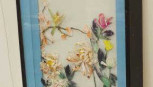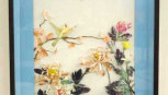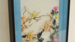 decorated with a scene depicting song birds in a flowering tree, hanging attachment on top of frame damaged, 92cm high, 45cm wide -