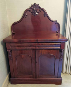 with shaped back board, fitted with two drawers, cupboards below, on plinth base. Width 106cm. -