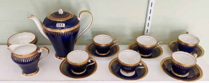 comprising coffee pot, sugar bowl and milk jug, six coffee cups and saucers. -