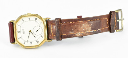 working, gilt and stainless steel case, quartz movement, leather unmatching band. -