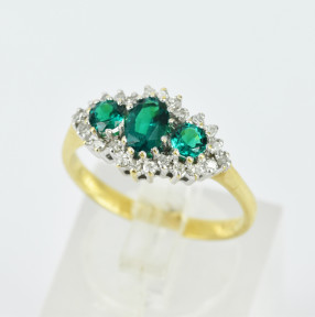 three synthetic round or oval emeralds surrounded by multiple diamonds, in 18ct yellow and white gold. Size O-P. Weight 3.5g. -