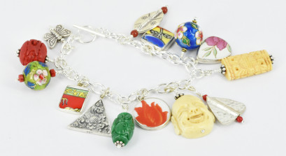 sterling silver chain, with resin, porcelain, bone charms. Weight all in 59g -