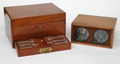 Lacking most contents but housing six glass bottles; together with a cased pair of aeronautical gauges, the box 27.5 wide. -