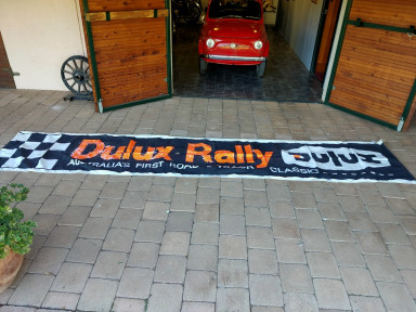 DULUX RALLY: A large Dulux Rally fabric flag. Measures approximately 442 cm W, 81.5 cm H. This is a rare flag due to the limited time that the Dulux Rally was run. INFORMATION NARRATIVE: The Dulux Rally was a new innovation to Australian motor sport, and was conducted between Sydney to Brisbane to Melbourne (1971, covering some 6500 kilometres) and Brisbane to Sydney to Melbourne (1972 covering some 4000 kilometres). It combined a tour of hillclimbs and racing circuits, with road rallying between them. The Dulux rally ran only for two years, 1971 - 1972, and was discontinued in 1973 due to: Dulux withdrawing its sponsorship to promote to the public through television advertisements' the complexity of organising the event' small fields in 1971 and 1972 making it probable that it would not develop further into a larger event as regards entry numbers' the sheer cost of conducting the event and the size of the sponsorship to be raised to replace -