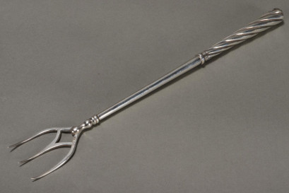 hallmarked Birmingham, 1888, with a tapering spiraled handle, above a long support and three pronged fork, total weight 50gm, length 27cm -