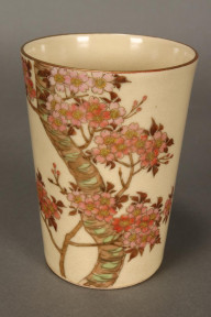 of tapering cylindrical form, decorated with blossom, in tones of pink and gilt, h 10cm -