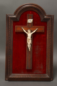 h 17cm, mounted on a cross set within an arched wooden frame, 57cm x 36cm -
