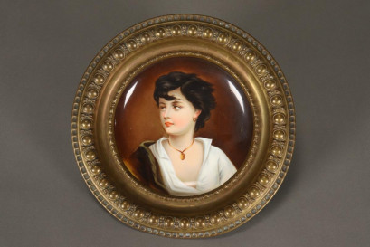 of shallow circular form, depicting the portrait of a young figure, wearing a white shirt, necklace and earrings, in tones of brown and white, set within a decorative metal frame, total diameter 24cm -