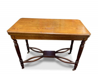 in mahogany, with hinged rectangular top, raised upon four spiraled legs united by curved stretchers, 92cm x 45cm -