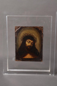 depicting Christ wearing a crown of thorns inscribed 'Ecce Homo,' 23.5cm x 18cm, set in a perspex frame, 42cm x 34cm -