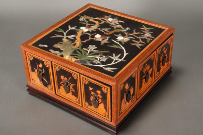 of square form, the top inlaid with a scene of figures perched within a tree, surrounded by carved drawer with drop handles, 14cm x 25cm x 25cm -