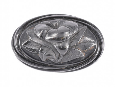 carved in jet, featuring a flower, chip to back, on brass. -
