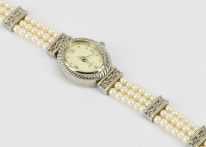with imitation pearls on stainless steel. quartz movement. -