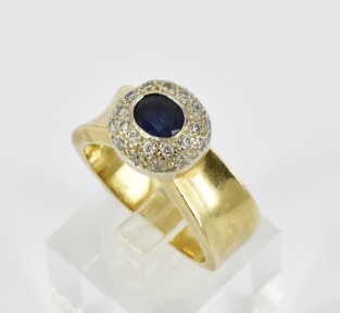 oval cut dark blue sapphire of approx. 0.70ct surrounded by diamond imitations in 9ct yellow gold. Size P. Weight 9g -