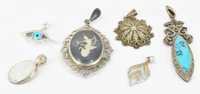 all silver, some set with paste and man-made stones, one with missing stones. Weight all in 33.7g -