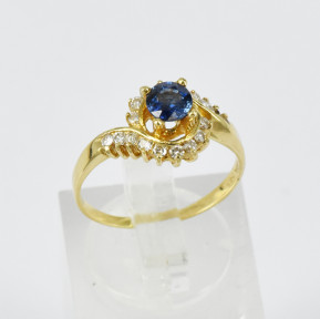 featuring a round blue sapphire surrounded by brilliant cut diamonds, set in yellow gold, stamped 18ct. Size M. Weight 2.7g.. -