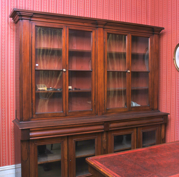 The rectangular cornice above four glazed panelled doors within stylised columnar pilasters, the lower section with two long frieze drawers and a further four glazed panelled doors, 217 x 225 x 52.5cm. Provenance: part of the original furnishings of the c -