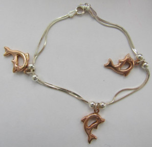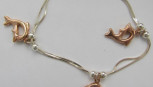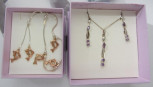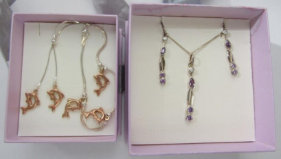 one set of earrings and necklace with purple and white crystals , the other necklace and bracelet with rose colour dolphins measures 26cm long total weight 19.75gms (4) -