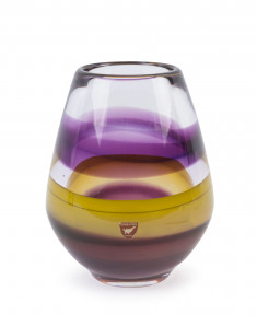 Lot Description:ORREFORS Swedish art glass vase, clear glass with bands of purple and yellow