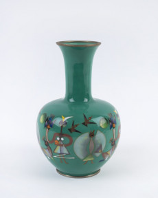 Lot Description:Japanese cloisonné vase decorated with geometric animals and figures on green ground, Showa period, 20th century
