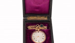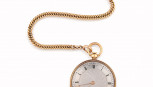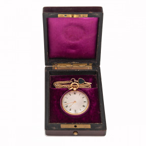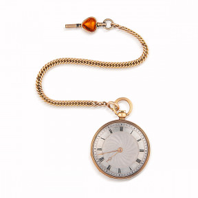 Dial: silvered, engine-turned, Roman numerals, Breguet hands Movement: French cylinder movement, key wind, key set Case: 18ct gold circular case with engine turned decoration with gold cuvette numbered 703 Case number: 703 Dimensions: 40mm diameter Signed: unsigned Accessories: gold curb link watch chain, gem-set heart-shaped winding key, fitted wooden box -