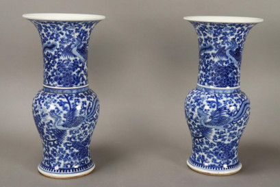 Lot Description:Good Pair of Chinese Blue and White Yan Yan Vases decorated continuously with phoenix on stylised floral ground