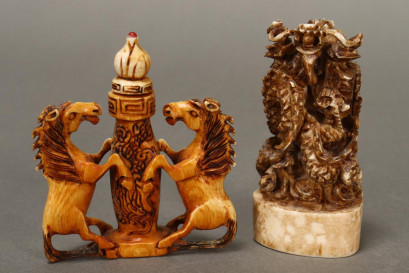 of slender form, flanked by two rearing horses, mark to base, height 7cm, together with a Chinese carved dragon seal, a/f, height 7.5cm (2) -
