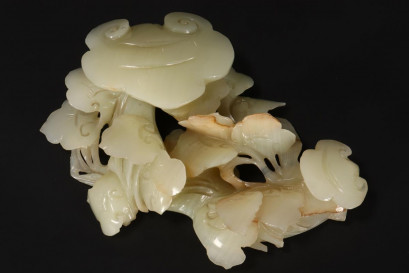 in the form of lingzhi growing from a large branch, in pale green tones, h 22cm and w 16cm -