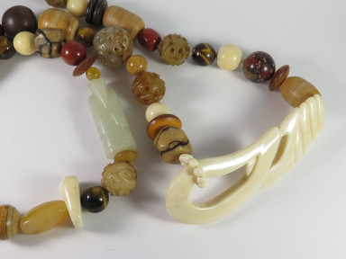 bone, ivory and jasper beads with carved bone pendant. Pendant 87 x 32mm. Length approx 78cm. -