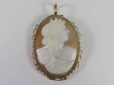 profile portrait of Diana in a scroll and bead frame; 9ct gold. 68 x 39mm. -