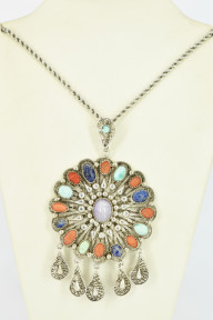 featuring lapis-lazuli, turquoise, amethyst on filigree silver mount, on a twisted 835 silver chain. Weight all in 71.2g. -