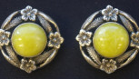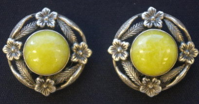 with green stone centered in a pieced flower & leaf setting stamped silver, width 2.5cm approx -