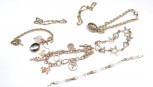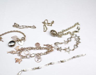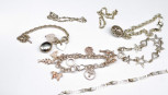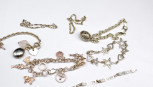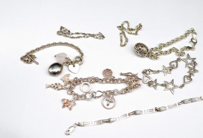 includes charm bracelet, toggle and cable chain, star and heart panel, egg and belcher examples. With mixed 925 marks, approx total weight 100 grams -