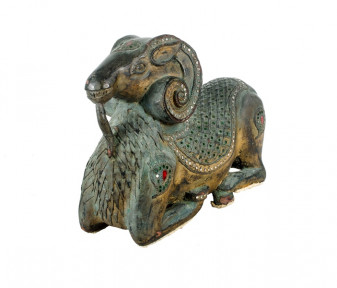 Curved wooden figure in the form of a reclining goat. With polychrome & inlaid glass decoration. (H27cm) -