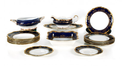 Katharina Pattern, cobalt with gilt. Comprising 6 dinner plates, 6 soup bowls, 2 entree plates, square dish, gravy boat with oval underplate & twin handled tureen, no lid (under plate restored). (18 pce's) -