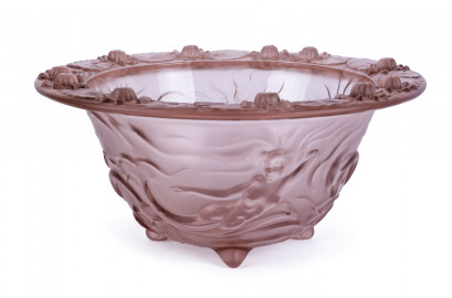 Lot Description:A Bohemian Art Deco pink glass fruit bowl with mermaids and lotus flowers by Josef Inwald Barolac, circa 1930
