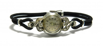 cream dial, silver batons & hands, stem wind movement, twelve round diamonds, 0.50ct mounted in a white gold case, cord band -