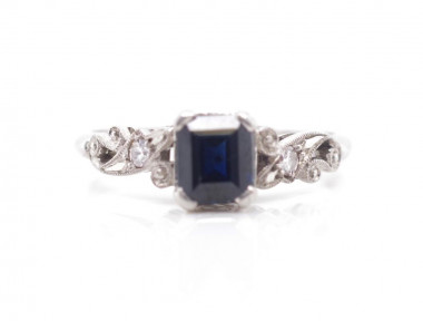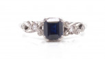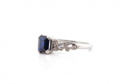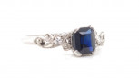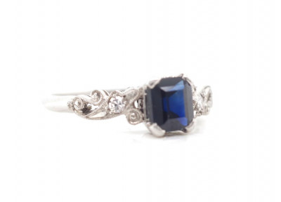 ring. With well done scroll work and mille grain shoulders set with single cuts. C. 1950s. Marked 18ct plat Approx emerald cut blue gemstone size 5.5mm x 4.5* test as spinel, weight 2.9 grams, ring size M-N -