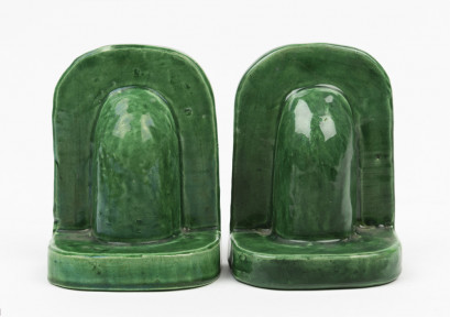 each modelled as a geometric style, with an bottle green glaze, one with factory mark 'Bosley ware Mitcham S Aust' to the back, Mitcham South Australia 1933-1946