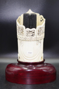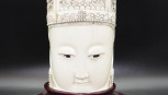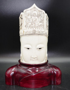 face of Buddha, with pierced and carved crown, (fine age cracks to face), signed to base, on fitted wood stand, (height 21cm approx, carved ivory face only).